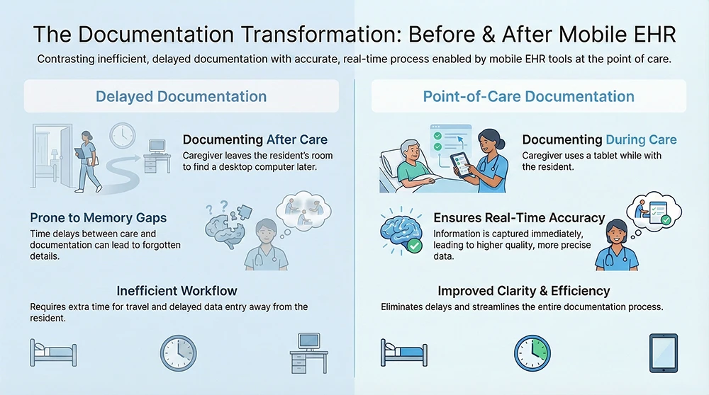 When staff complete care first and document later, details fade. Time stamps blur. Important observations may never make it into the record (5). Mobile EHR tools reduce this gap by letting staff document in real time or immediately after care.