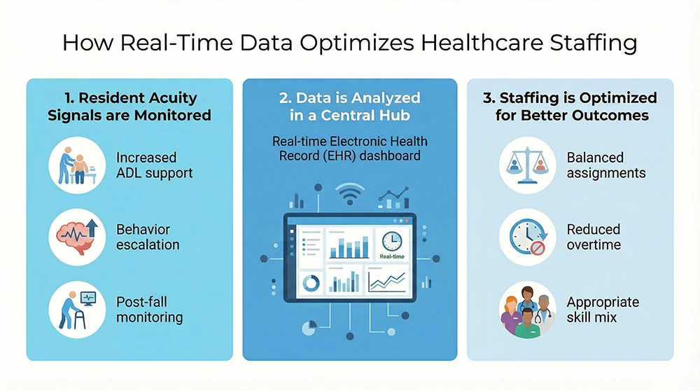 Traditional staffing models often rely on census or historical patterns. Those approaches miss daily fluctuations in resident need. An EHR is designed to capture clinical information over time, including changes that affect workload (2)(8).