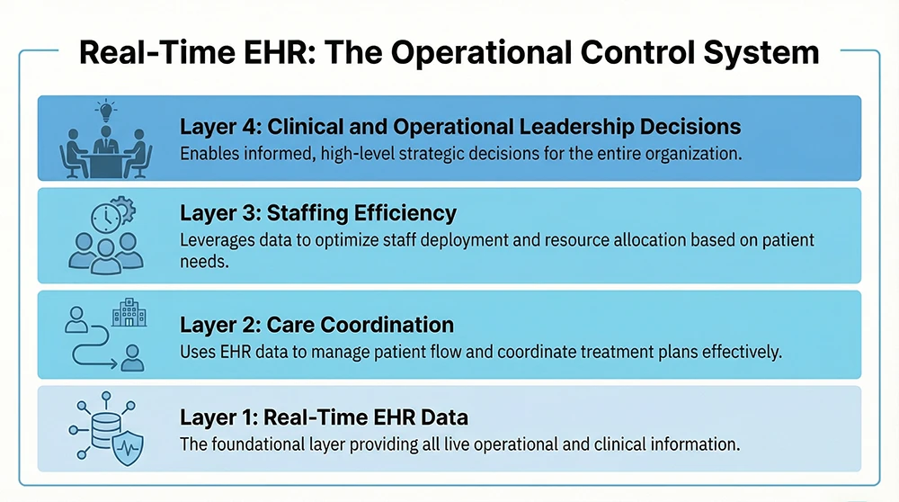 Real-time data visibility changes how you lead. An electronic health record is intended to make health information available at the point of care and across the organization, not just stored for later review (1)(2). When that information updates as care happens, you move from reacting to problems after the fact to guiding care and staffing decisions while they still matter.