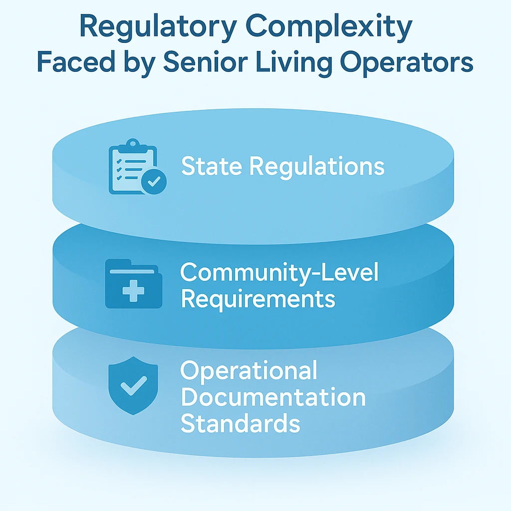 Senior living rules are complex because each state writes its own standards. When we operate in more than one state, we must follow several rule sets at the same time. These rules affect assessments, care plans, medications, staffing, and incidents (1)(2). Without a consistent system, documentation varies from site to site and the chance of mistakes grows.