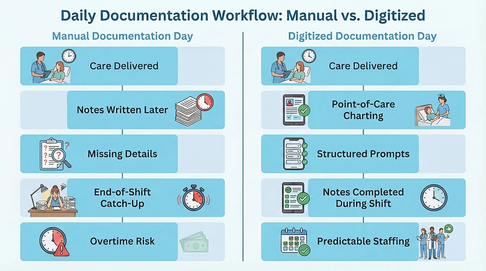 Structured documentation, task prompts, and consistent workflows reduce guesswork. Over time, you see fewer end-of-shift backlogs because the work gets done in smaller pieces throughout the day. The financial impact shows up as steadier staffing, fewer overtime spikes, and less supervisor time spent fixing records.